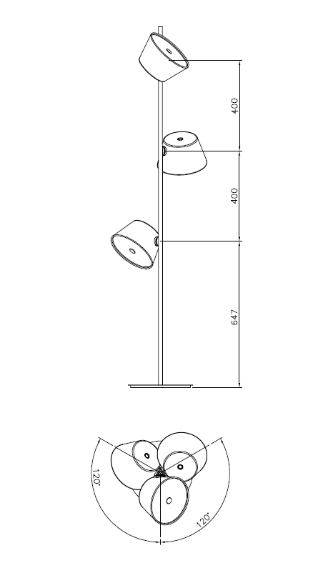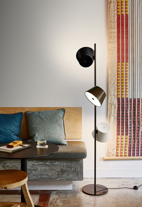 Die Stehlampe hat ein schwarzes Gestell sowie drei schwarze Schirme entlang des Gestells. Die Schirme können um 360° gedreht werden, was es ermöglicht, das Licht an alle Bedürfnisse anzupassen.