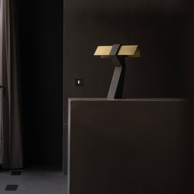 Die Tischlampe besteht aus einem Sockel aus Beton und einem dreieckigen Schirm aus Messing. Die Form des Schirms sorgt für ein nach unten gerichtetes Licht, das blendfrei und angenehm im Raum wirkt.