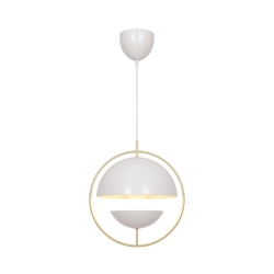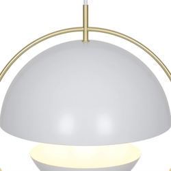 Tavia ist eine dekorative Pendelleuchte mit einem minimalistischen Design und glamourösem Ausdruck. Die zwei halbrunden matten Schirme in Weiß sind von einem eleganten Ring in glänzendem Messing umgeben und sorgen für ein angenehmes Licht.