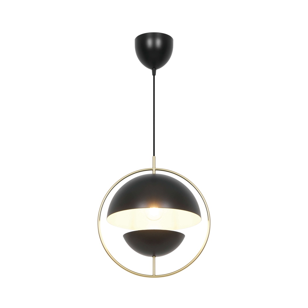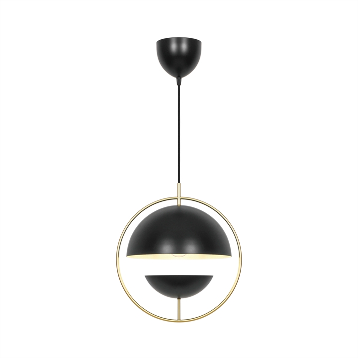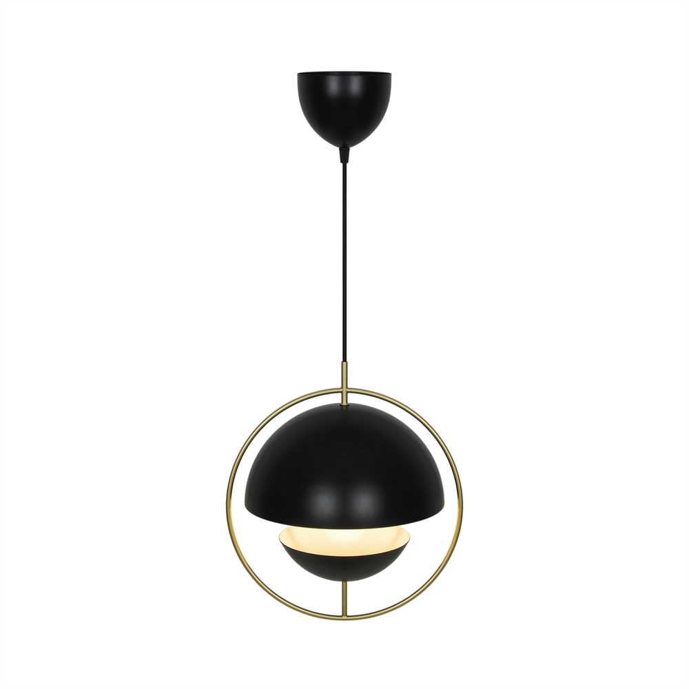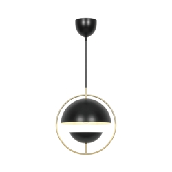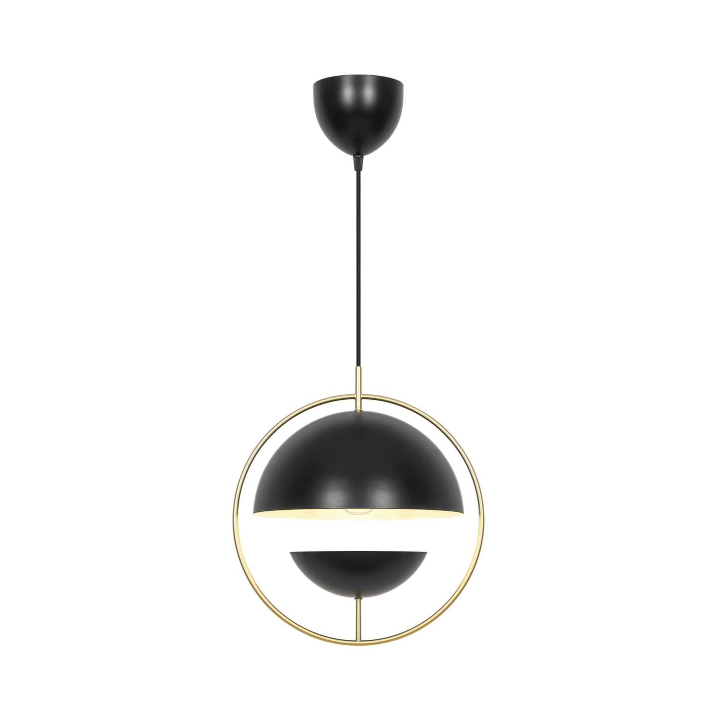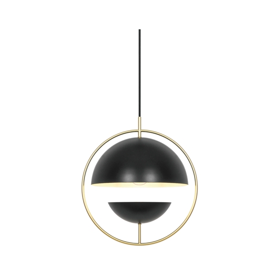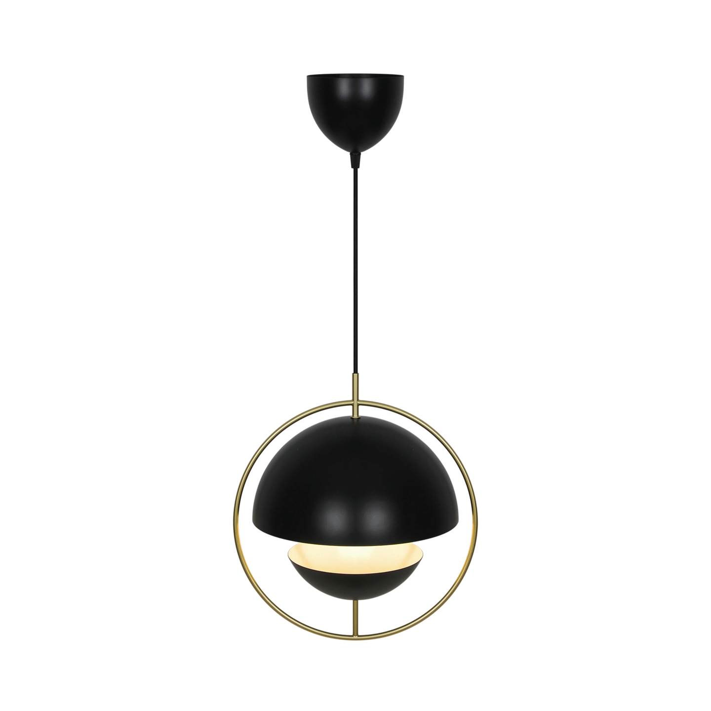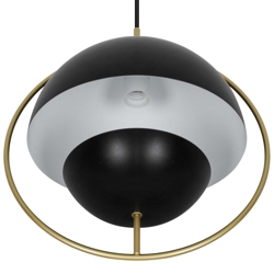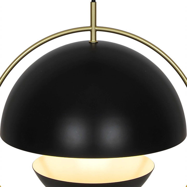 Tavia ist eine dekorative Pendelleuchte mit einem minimalistischen Design und glamourösem Ausdruck. Die zwei halbrunden matten Schirme in Schwarz sind von einem eleganten Ring in glänzendem Messing umgeben und sorgen für ein angenehmes Licht.