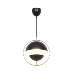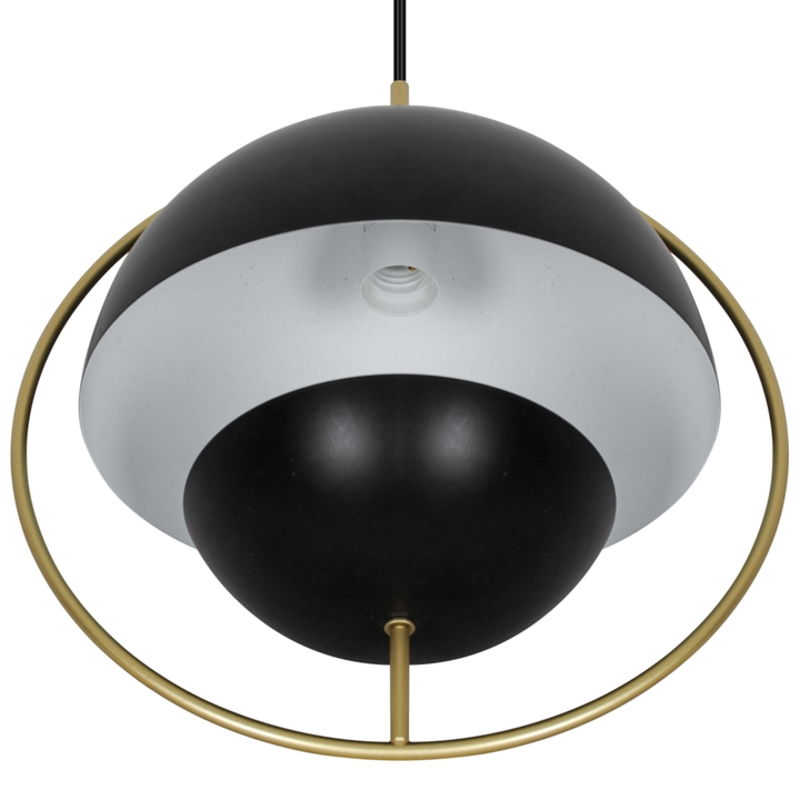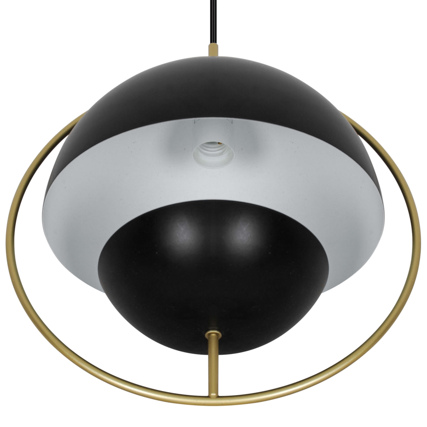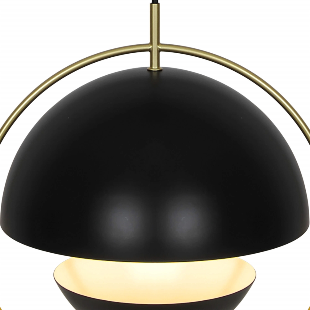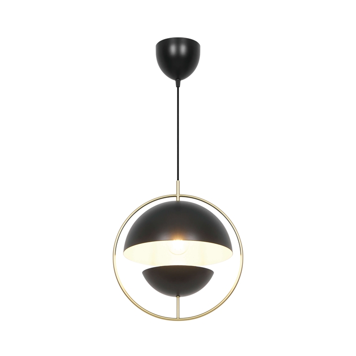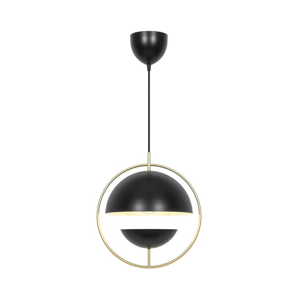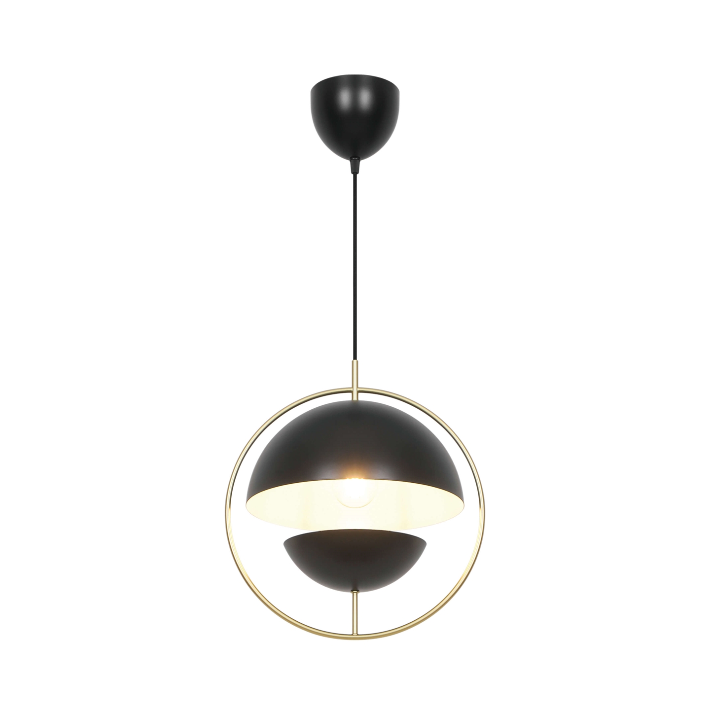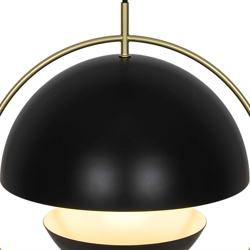 Tavia ist eine dekorative Pendelleuchte mit einem minimalistischen Design und glamourösem Ausdruck. Die zwei halbrunden matten Schirme in Schwarz sind von einem eleganten Ring in glänzendem Messing umgeben und sorgen für ein angenehmes Licht.