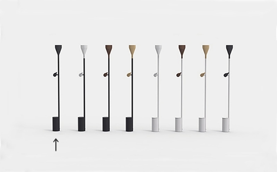 Timber Floor ist neben Schwarz auch in Weiß mit Spot und Uplight in vier verschiedenen Varianten erhältlich: Eiche, Walnuss, weiß gebeizte Esche oder schwarz gebeizte Esche. Hier ist Timber Floor mit Spot und Uplight in Walnuss gezeigt.