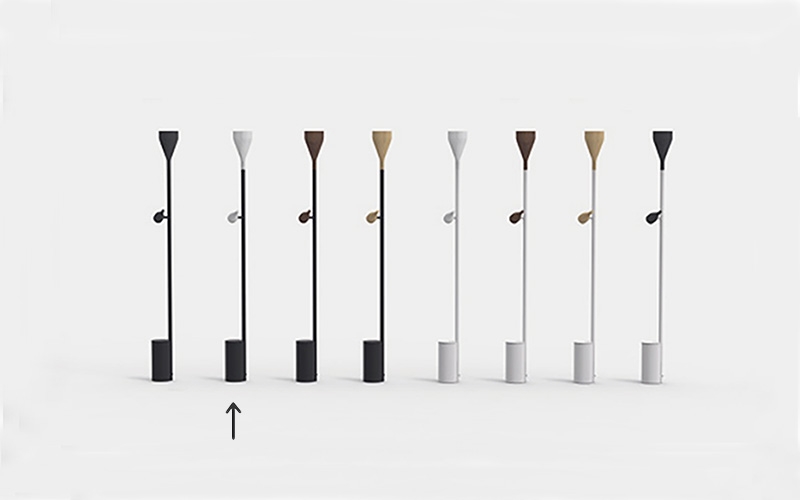 Timber Floor ist neben Schwarz auch in Weiß mit Spot und Uplight in vier verschiedenen Varianten erhältlich: Eiche, Walnuss, weiß gebeizte Esche oder schwarz gebeizte Esche. Hier ist Timber Floor mit Spot und Uplight in Walnuss gezeigt.