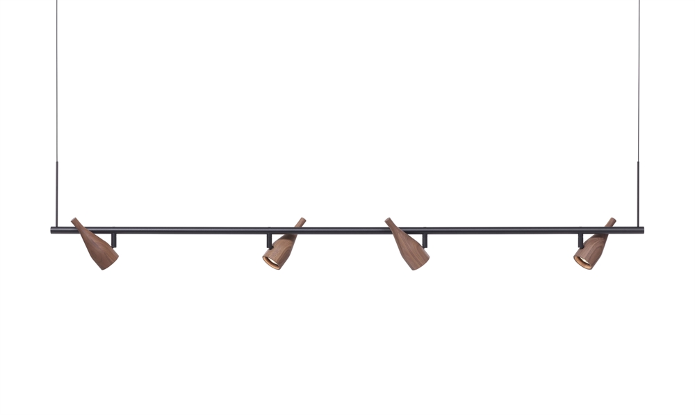 Timber Line 4 hat vier bewegliche Spots. Die Pendelleuchte kann über einem Esstisch oder Schreibtisch verwendet werden oder vielleicht, um einen Schrank oder eine Wand zu beleuchten.