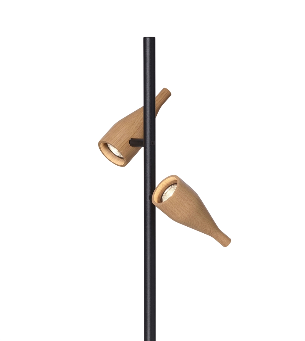 Lounge Double in der Timber-Serie ist eine Stehlampe mit zwei beweglichen Spots, die die Lampe beispielsweise als Leselampe nutzbar machen.