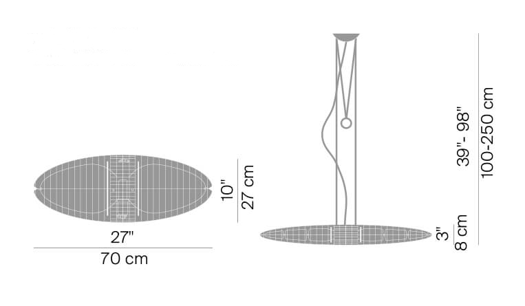 Die Titania Pendelleuchte ist mit ihrer elliptischen Form eine elegante Fusion aus Funktion und Design. Das Licht wird wunderschön durch den transparenten Schirm mit Aluminiumlamellen reflektiert, die gleichzeitig die Glühbirne verbergen. Ein Gegengewicht zwischen Schirm und Decke ermöglicht die Höhenverstellung des Schirms, und die mitgelieferten Filter aus Polycarbonat in den Farben Gelb, Rosa, Hellblau und Violett ermöglichen es, die Farbe der Pendelleuchte zu ändern, ohne das weiße Licht der Lampe zu verändern.