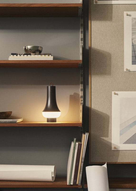 Batterielampe Tomoshi Portable ist eine tragbare Tischleuchte mit einem weichen blendfreien Licht, das ein schönes nach unten gerichtetes und 360° umgebendes Licht bietet.
