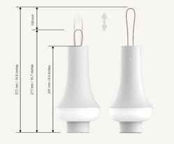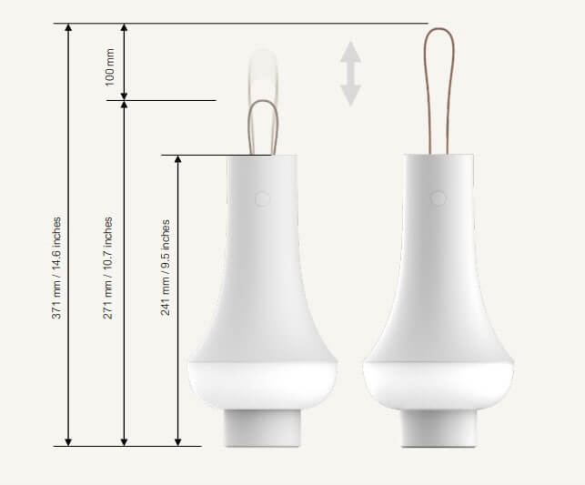 Die Batterielampe hat ein mattes Finish und ist mit einem Lederband ausgestattet, das weiter herausgezogen werden kann, sodass die Lampe leicht mitgenommen oder aufgehängt werden kann. Die tragbare Lampe verfügt über eine stufenlose und 4-stufige Dimmung (5%, 20%, 45%, 100%). Sie kann 5,5 Stunden bei 100 Prozent Helligkeit, 15 Stunden bei 45%, 38 Stunden bei 20% und 48 Stunden bei 5% leuchten und lässt sich einfach mit dem mitgelieferten USB-Kabel aufladen.