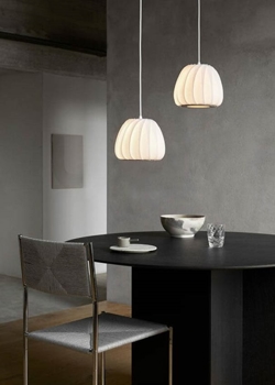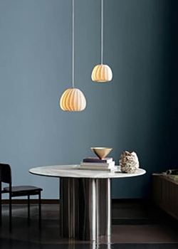 Die TR12 hat ein sehr klassisches Aussehen, das mit seinen weichen und runden Formen den Esstisch sowohl allein als auch in Gruppen von mehreren Pendelleuchten schön ergänzt. Die Pendelleuchte ist in zwei verschiedenen Materialien erhältlich: Birke und Papier. Die Materialien des Schirms haben unterschiedliche Ausdrücke und Beleuchtungsgrade. Der weiße Farbton sorgt für ein gleichmäßiges, allgemeines Licht in einem angenehmen weißen Ton, während die Birken-Pendelleuchten ein weicheres und wärmeres Licht abgeben.