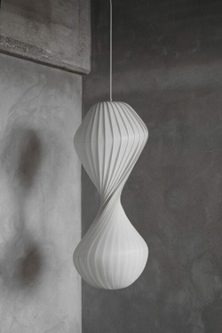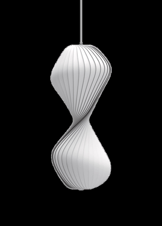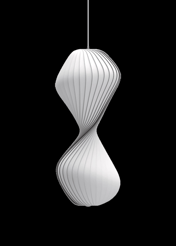 Die TR32 Pendelleuchte hat eine elegante Sanduhrform, bei der der Schirm die Lichtquellen umschließt und das Licht diffus und weich im Raum erscheinen lässt. Die schöne Pendelleuchte hat ein skulpturales Aussehen und ist daher auch schön, wenn das Licht nicht eingeschaltet ist.