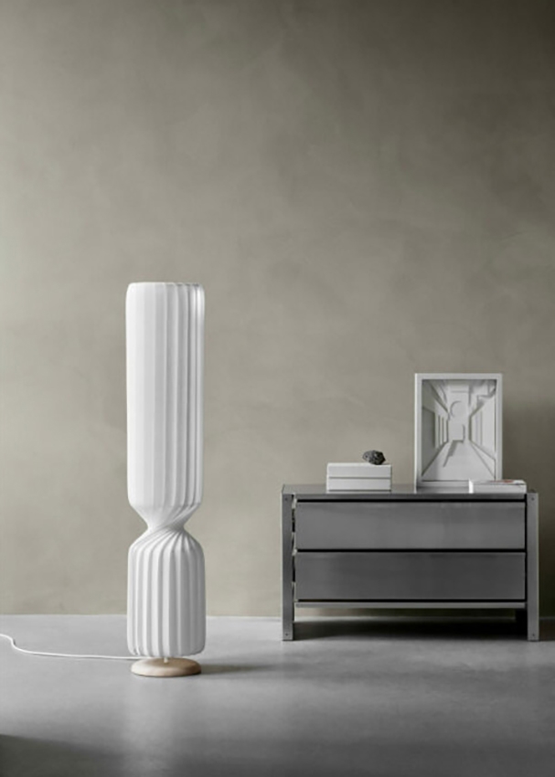 Der Lampenschirm der Pendelleuchte ist mit einem Stück Birkenholz an der Oberseite montiert, ebenso steht die Stehleuchte auf einem Fuß aus Birkenholz, der dem scharfen skulpturalen Ausdruck der Serie einen warmen und natürlichen Touch verleiht.