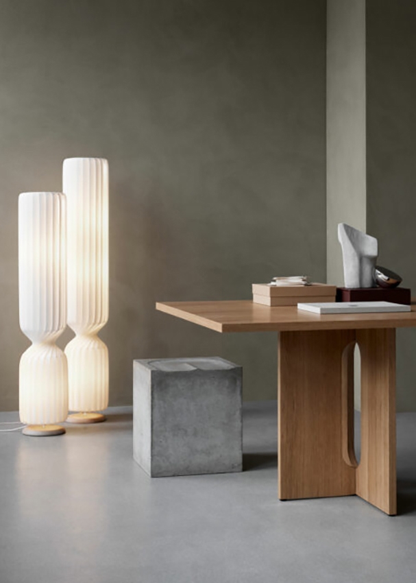 Der Lampenschirm der Pendelleuchte ist oben mit einem Stück Birkenholz zusammengefügt, ebenso steht die Stehleuchte auf einem Fuß aus Birkenholz, der dem scharfen skulpturalen Ausdruck der Serie eine warme und natürliche Note verleiht.