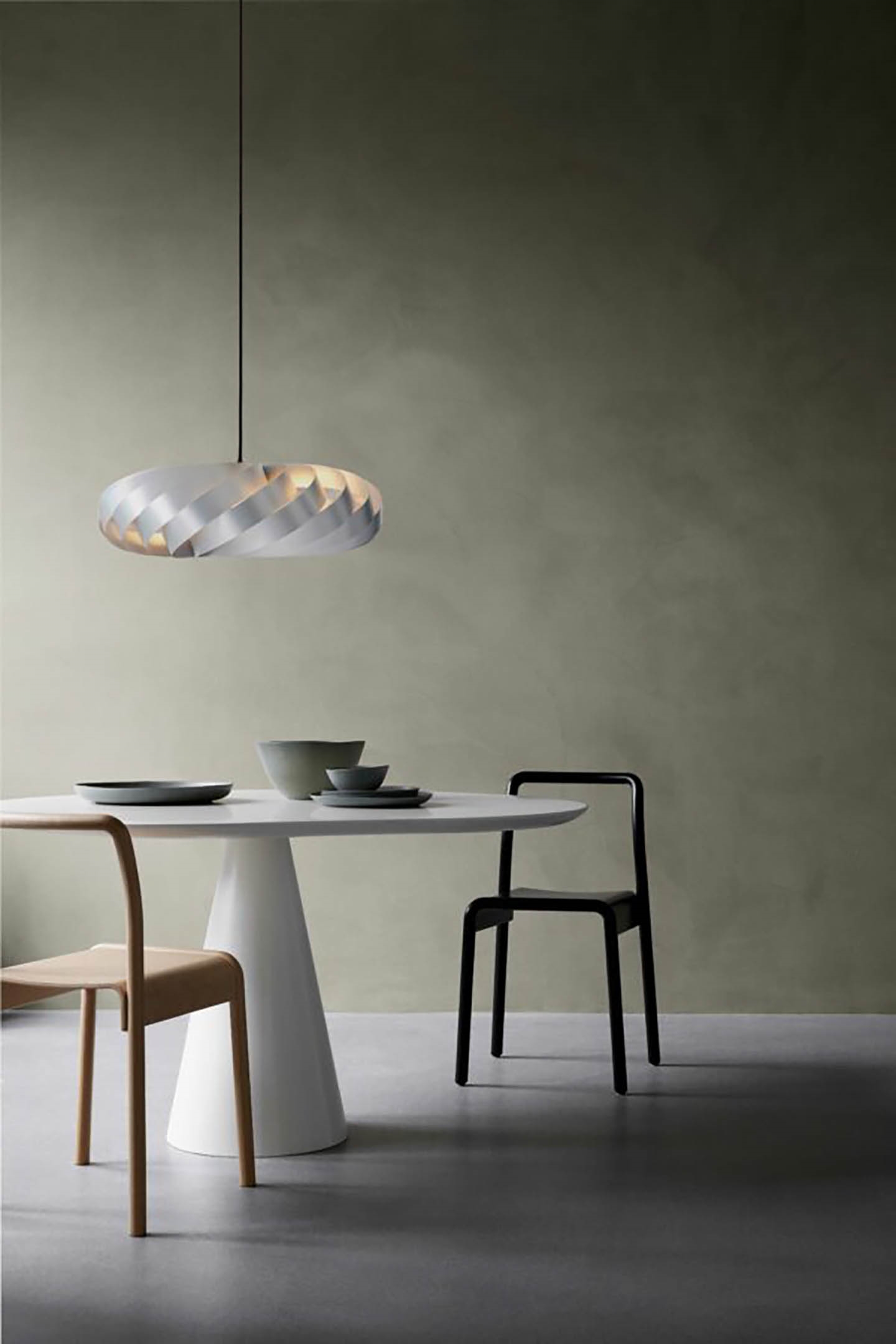 Die schöne Pendelleuchte hat eine gedrehte Form, die das Licht in alle Richtungen streut, aber gleichzeitig die Lichtquelle abschirmt. Daher ist sie sowohl eine gemütliche als auch funktionale Lampe, die aus guter Handwerkskunst gefertigt ist. Die Lampe ist ideal über dem Ess- oder Küchentisch und kann problemlos mit anderen Tom Rossau Pendelleuchten kombiniert werden.