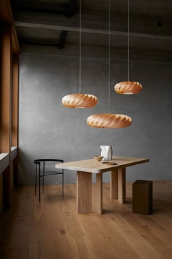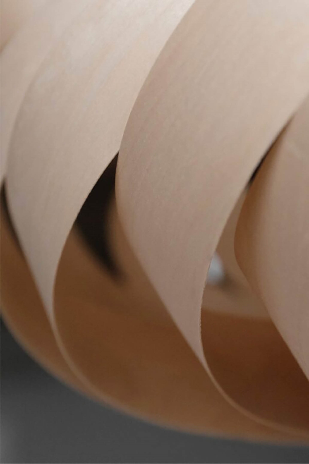 Die Birkenlamellen der Pendelleuchte können im Laufe der Zeit eine schöne Patina entwickeln, wobei sich die Struktur des Holzes leicht verändert. Dies betont die Maserung des Holzes und macht sie etwas heller.