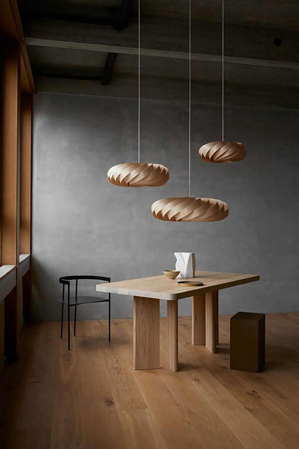 Die Birkenlamellen der Pendelleuchte können im Laufe der Zeit eine schöne Patina entwickeln, wobei sich die Struktur des Holzes leicht verändert. Dies betont die Maserung des Holzes und macht sie etwas heller.