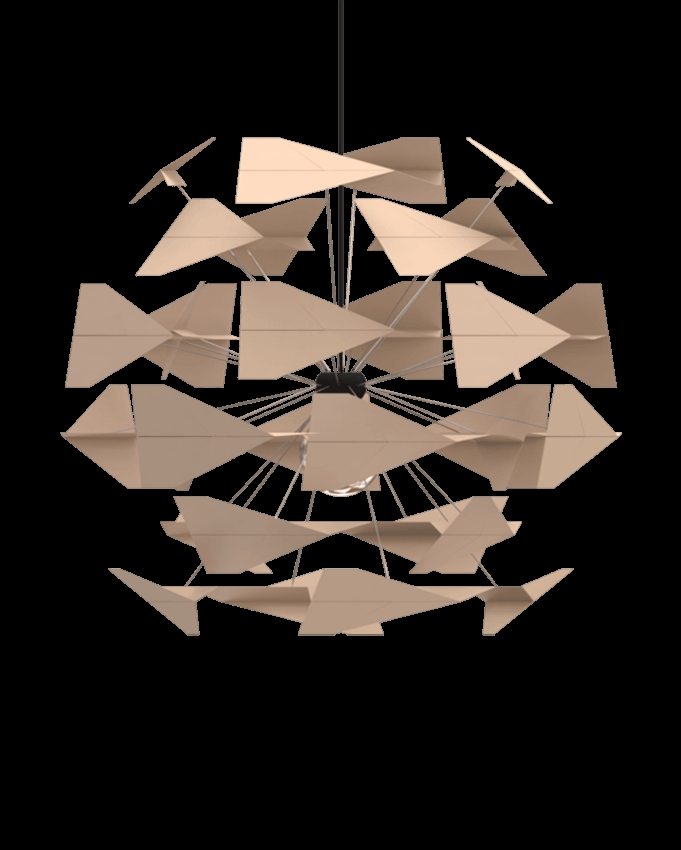 Die TR747 Pendelleuchte, besser bekannt als "Come fly with me", besteht aus 32 handgefalteten Flugzeugen. Diese 32 Papierflugzeuge umhüllen die Lichtquelle, wodurch das Licht sanft und warm im Raum verteilt wird. Das Design der Lampe entstand aus der Kindheit von Tom Rossau, als er mit seinem Großvater im Wohnzimmer Papierflugzeuge bastelte.