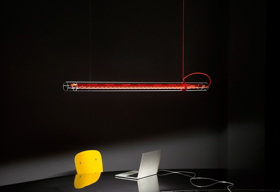 Tubular ist eine multifunktionale Glasleuchte. Das Glasrohr kann um 360 Grad gedreht werden und kann als Downlight, Uplight oder Wallwasher verwendet werden. Die Tubular Pendelleuchte besteht aus Glas, Metall, Textil und Kunststoff. Die Pendelleuchte ist mit rotem Diffusor und rotem Kabel oder mit weißem Diffusor und blauem Kabel erhältlich