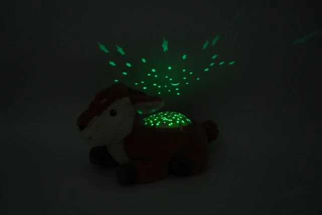 Durch Drücken auf den Rücken des Rehkitzes leuchten die Sterne auf, die 45 Minuten lang leuchten und dann automatisch erlöschen. Die Kinder können daher langsam in einen ruhigen Schlaf gleiten.