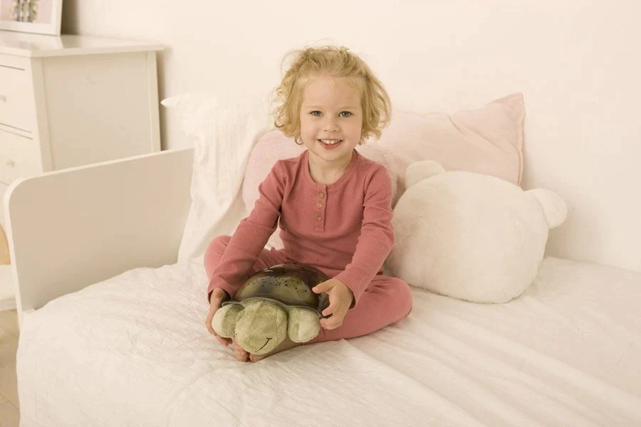Die funkelnde Twilight Turtle schafft eine gemütliche und sichere Atmosphäre für jedes Kind. Die Schildkröte ist immer bereit für ein Nickerchen und hilft allen Kindern, einzuschlafen. Sie bietet ein ruhiges und entspannendes Licht vor dem Schlafengehen in Form eines Sternenhimmels, was die Nacht viel weniger beängstigend und viel lustiger macht. Der Sternenhimmel kann an die Wand oder die Decke projiziert werden, wobei zwischen den drei verschiedenen Farboptionen Grün, Blau und Bernstein/Rot gewählt werden kann. Grün repräsentiert die Natur, Blau hilft, die Sinne zu beruhigen, und Bernstein schafft Wärme. Gleichzeitig kann die Lampe auch zwei verschiedene beruhigende Melodien abspielen