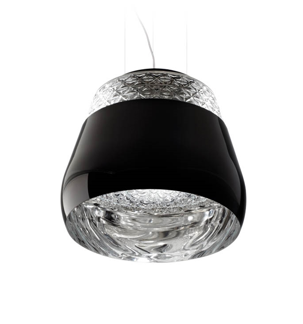 Die Pendelleuchte ist elegant gestaltet mit kristallklarem, mundgeblasenem Glas und Metallschirm, der den feinen Eindruck eines endlosen Lichtbouquets erzeugt.