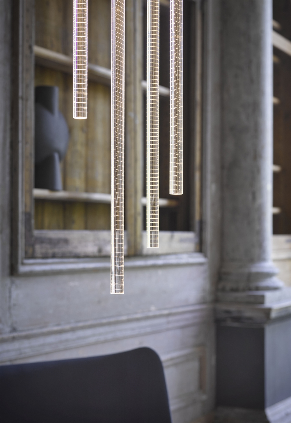Die Pendelleuchte besteht aus einem LED-Rohr aus geätztem Glas, das das Licht schön im Raum bricht.