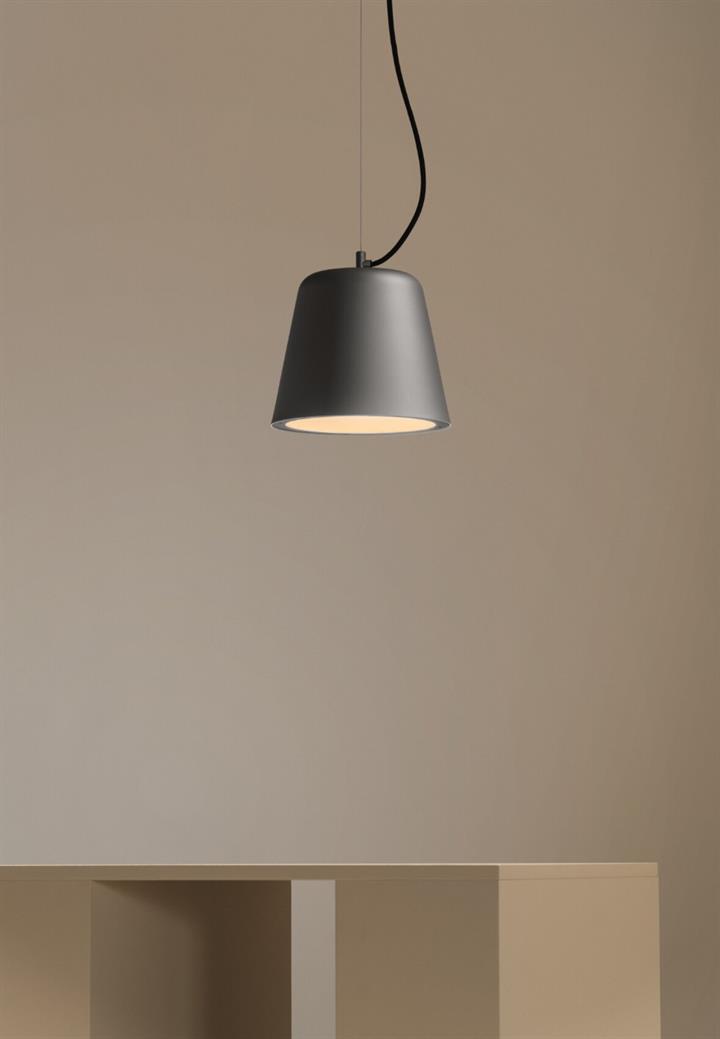 Vaso ist eine einfache und effektive Pendelleuchte, die mit ihrem konisch geformten Design und ihrer leicht gebogenen Oberfläche eine Vielzahl von Anwendungsmöglichkeiten bietet. Hängen Sie sie einzeln oder in Reihe auf. Das zeitlose Design und die kraftvolle Lichtquelle können in vielen Kontexten verwendet werden.