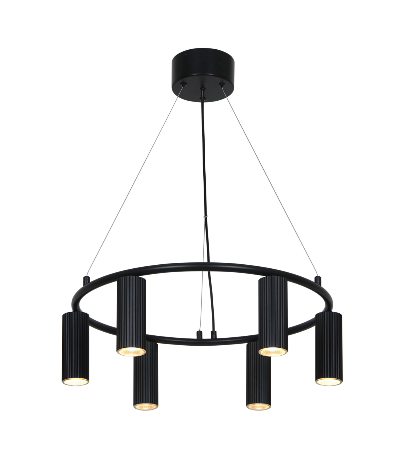 Der Vico Kronleuchter hat ein minimalistisches und stromlinienförmiges Design und verkörpert skandinavische Eleganz. Der Kronleuchter mit sechs geriffelten Schirmen eignet sich perfekt als Lampe über dem Esstisch, kann aber auch im Eingangsbereich und anderen Räumen mit viel Platz und Bedarf für nach unten gerichtetes Licht verwendet werden.