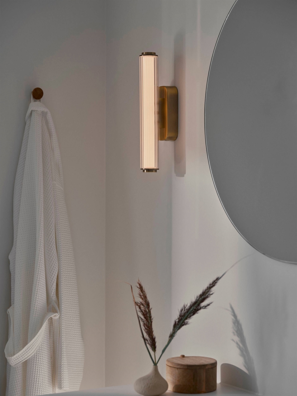 Die Wandleuchte Virelle 32 kombiniert zeitloses Design mit funktionalem Licht und ist dank ihrer IP44-Klassifizierung ideal für Badezimmer und die meisten anderen Innenbereiche geeignet. Die dekorative Leuchte mit integrierter LED-Lichtquelle verfügt über einen geriffelten Schirm, der dem Raum eine schöne Textur verleiht. Die Farbtemperatur des klaren und angenehmen Lichts kann bei der Installation auf warmweißes Licht mit 3000K oder auf kaltweißes Licht mit 4000K eingestellt werden.
