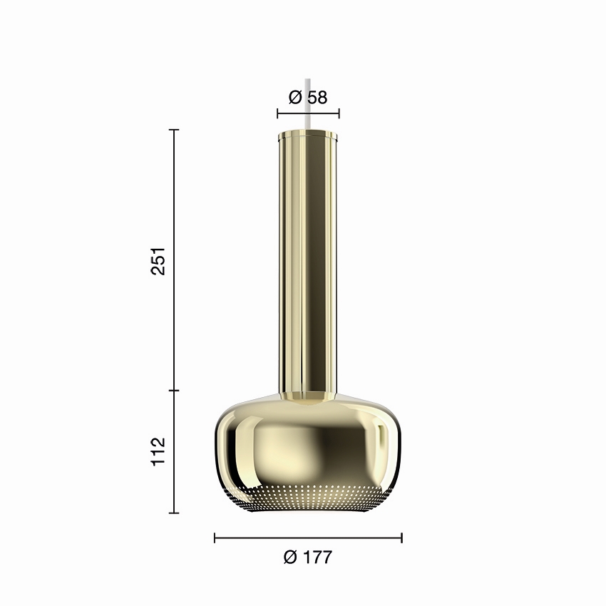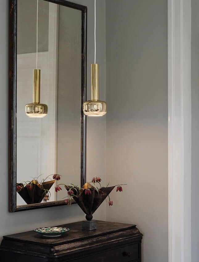 Die VL 56 Pendelleuchte ist aus poliertem unbehandeltem Messing gefertigt und die Pendelleuchte ist auch in Chrom erhältlich.