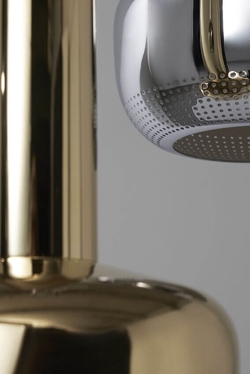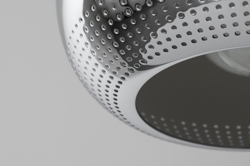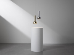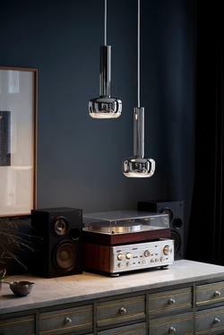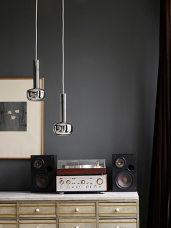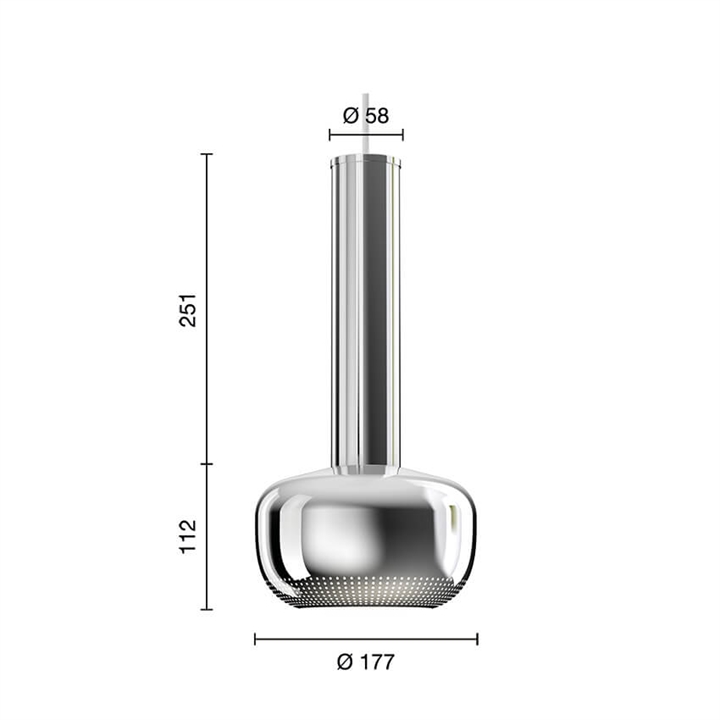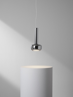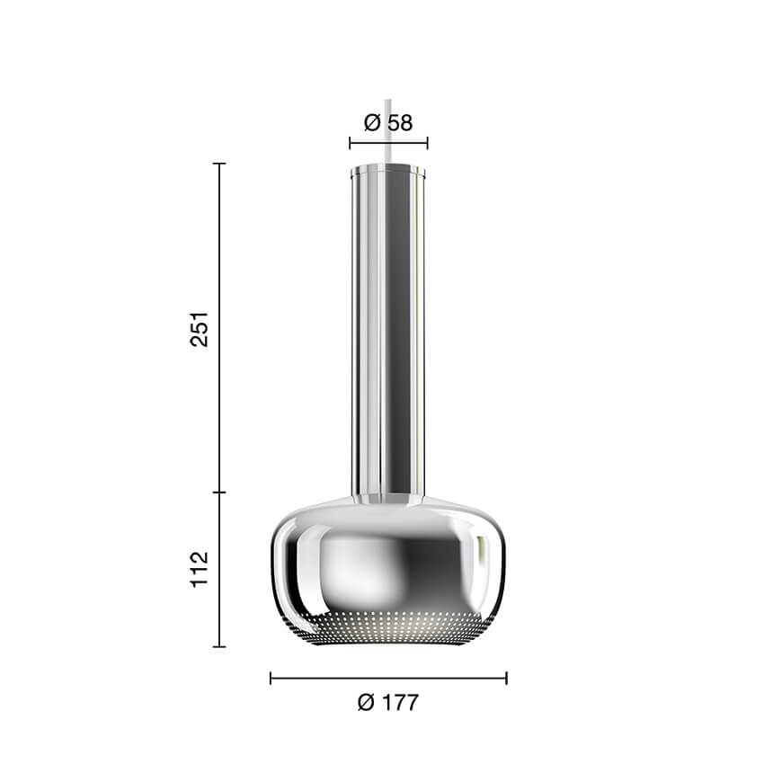 Die VL 56 Pendelleuchte besteht aus verchromtem Aluminium und ist auch in Messing erhältlich.