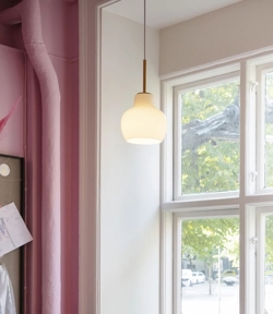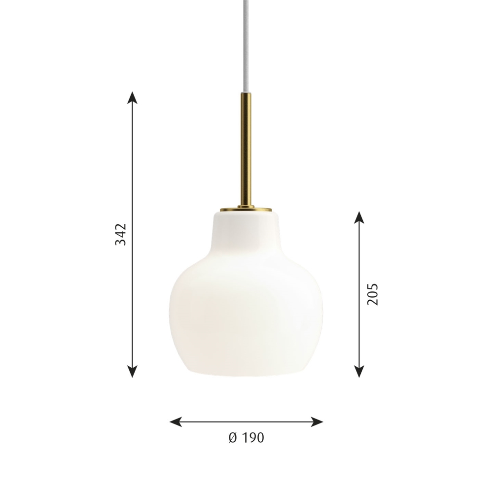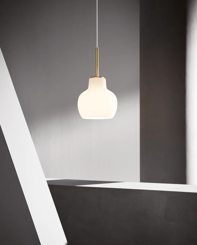 Die VL Ringkrone Leuchten basieren auf dem Originaldesign aus den 1930er Jahren, das für das Radiohuset in Kopenhagen entworfen wurde. Die einzigartigen VL Ringkrone Leuchten wurden 2019 mit Details aus Messing und Schirmen aus blankem, weißem mundgeblasenem Opalglas in drei Schichten wie die ursprünglichen Lampen neu aufgelegt.