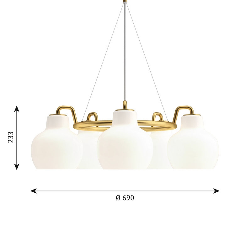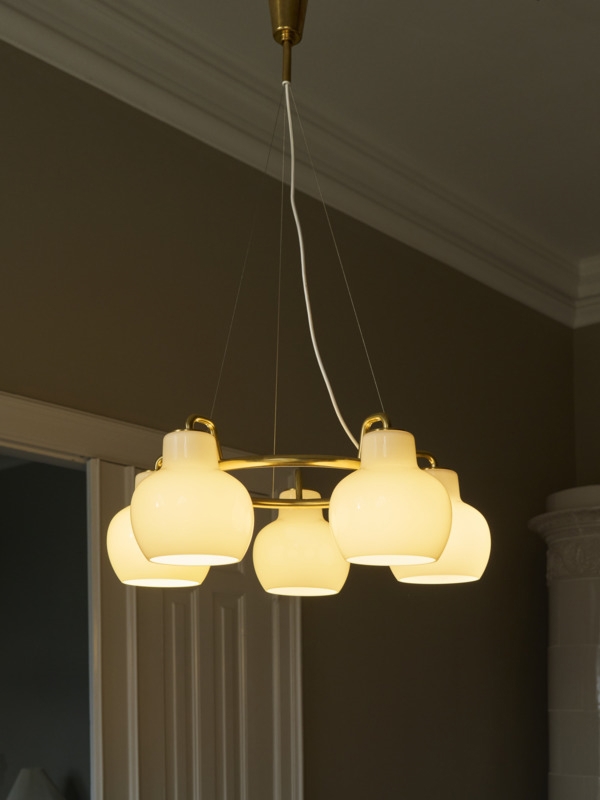 Die VL Ringkrone Lampen basieren auf dem Originaldesign aus den 1930er Jahren, das für das Radiohuset in Kopenhagen entworfen wurde. Die einzigartigen VL Ringkrone Lampen wurden 2019 mit Details aus Messing und Schirmen aus glänzendem, weißem mundgeblasenem Opalglas in drei Schichten wie die ursprünglichen Lampen neu aufgelegt.