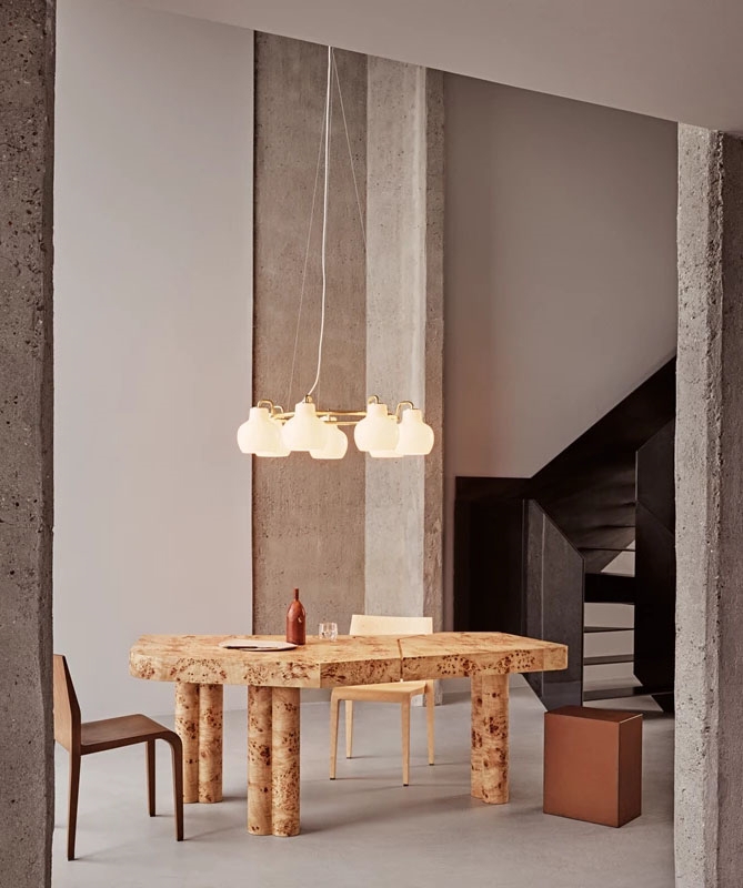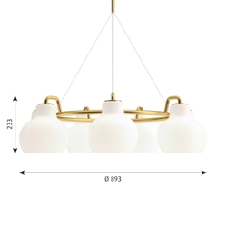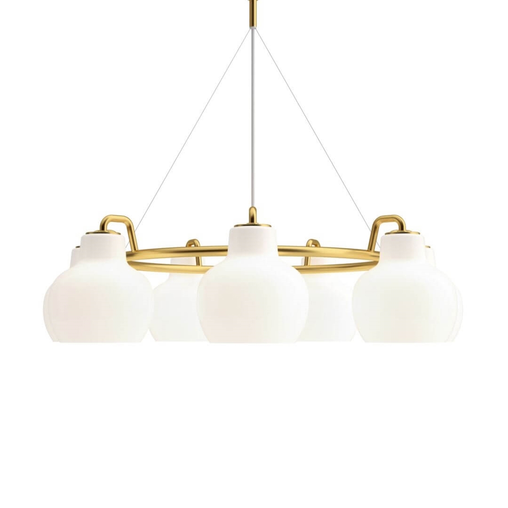 Die VL Ringkrone Leuchten basieren auf dem Originaldesign aus den 1930er Jahren, das für das Radiohuset in Kopenhagen entworfen wurde. Die einzigartigen VL Ringkrone Leuchten wurden 2019 mit Details aus Messing und Schirmen aus blankem, weißem mundgeblasenem Opalglas in drei Schichten, wie die ursprünglichen Lampen, neu aufgelegt.