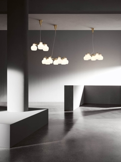 Die VL Ringkrone strahlt ein angenehmes und warmes Licht aus, das in jede Einrichtung passt. Der Schirm besteht aus mundgeblasenem Opal-Dreischichtglas mit Aufhängung und Baldachin aus unbehandeltem poliertem Messing, das patinieren wird. Die Pendelleuchten sind mit einem, drei, fünf oder sieben Schirmen erhältlich.