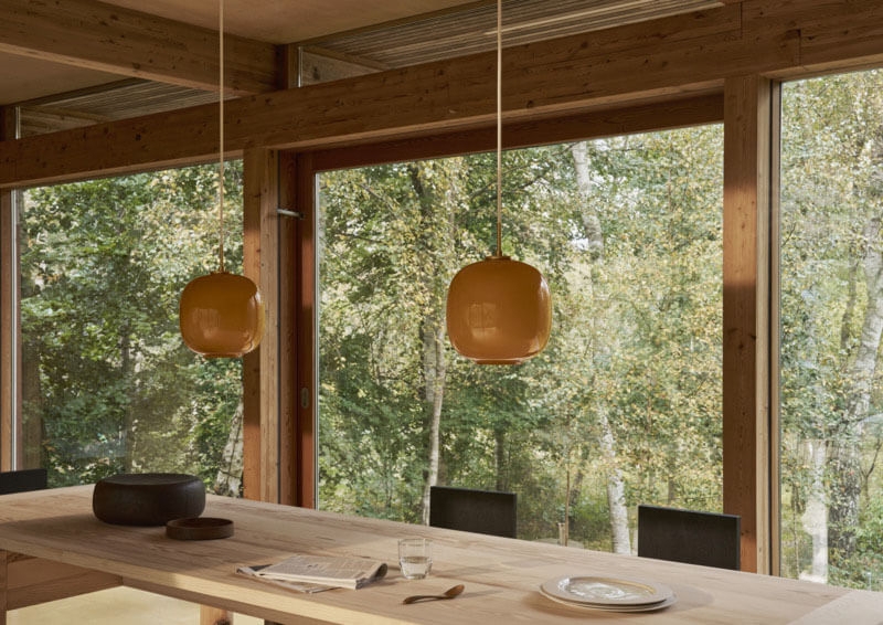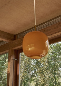 Die ursprüngliche Radiohus Pendelleuchte wurde in den 1940er Jahren für das Radiohuset in Zusammenarbeit mit Louis Poulsen entworfen. Die Radiohus Lampe wurde 2016 als VL45 Radiohus Pendelleuchte neu aufgelegt. Diese Variante in Amber wurde 2025 eingeführt und hat eine Oberseite aus Messing und einen farbigen Schirm aus vierlagigem Glas mit glänzender Außenseite und glänzend weißer Innenseite.