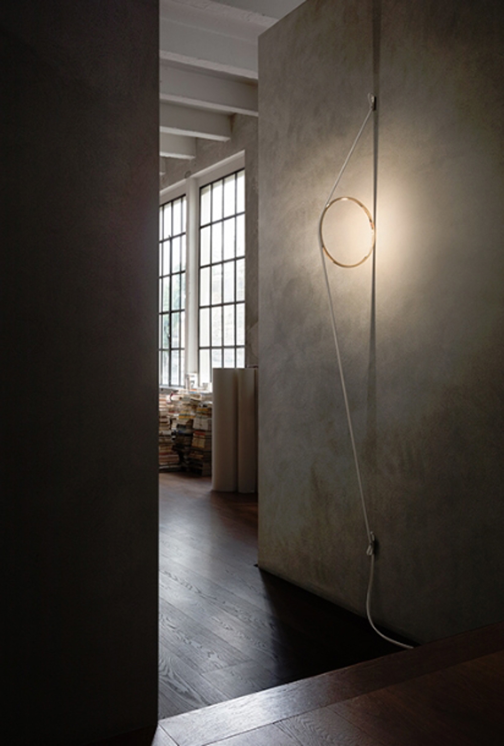 Wirering Wandleuchte mit grauem Kabel & goldenem Ring – entworfen von Formafantasma für Flos im Jahr 2018.