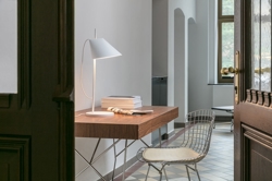 Der Schirm kann gedreht, geneigt, gehoben und gesenkt werden, sodass das Licht immer genau dort hinfällt, wo es gewünscht wird. Die integrierte LED-Lichtquelle liefert hauptsächlich ein nach unten gerichtetes und blendfreies Licht, ideal zum Arbeiten oder Lesen, während die dezente Öffnung oben im Schirm ein sanftes nach oben gerichtetes Licht abgibt.